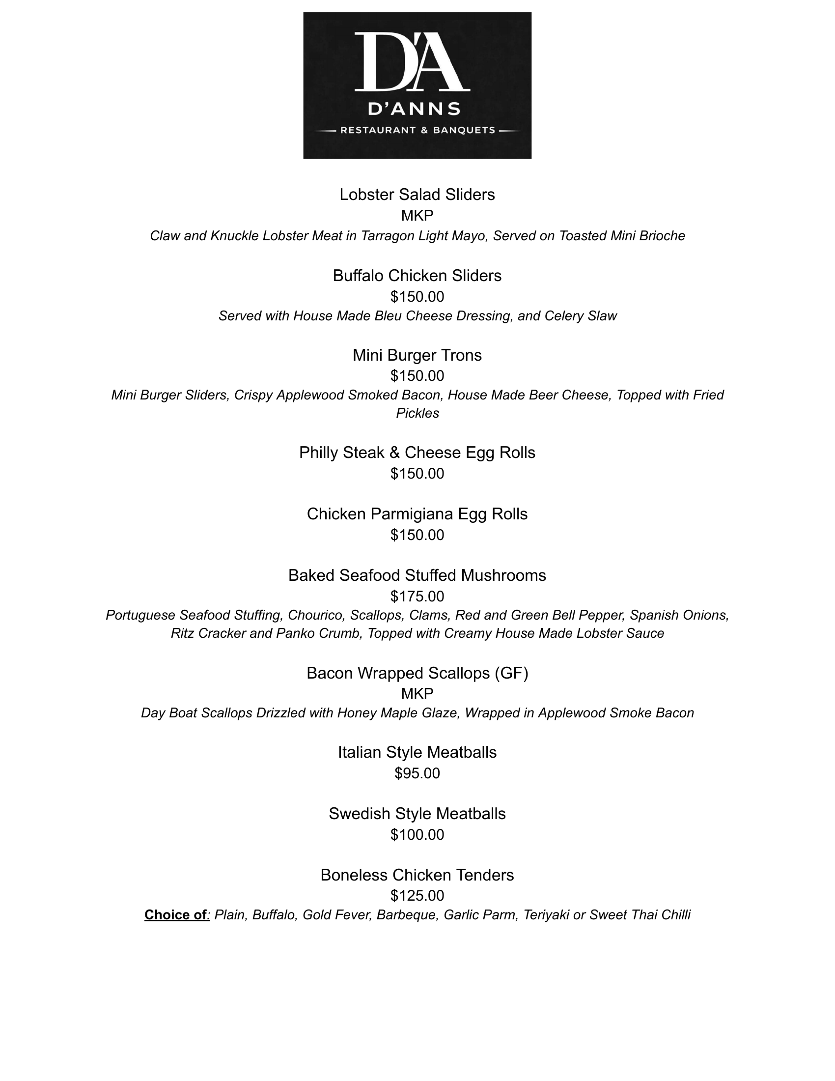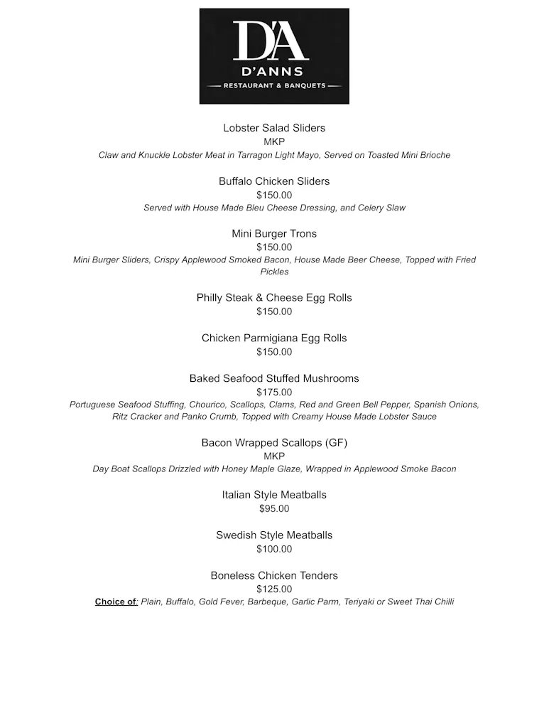 Planning your next unforgettable private event should be straight forward, at D'Ann's it is! From banquet dinners, to baby showers, bridal showers, birthdays, anniversaries, graduations, bereavements, etc., we have the space to match your needs. Let our function coordinator and executive chef personally customize your menu for you. Email us at dannsportsrestuarant@gmail.com to start planning your next private event.
